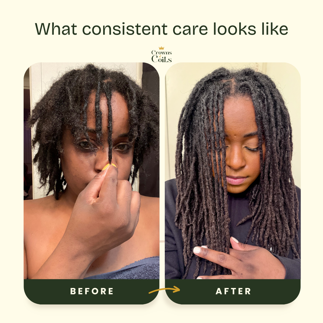 Created with intention and tested on real crowns, this everyday pairing delivers lightweight hydration, scalp support, and long-term strength without buildup. Designed to respect the integrity of your locs while supporting healthy growth from root to tip.